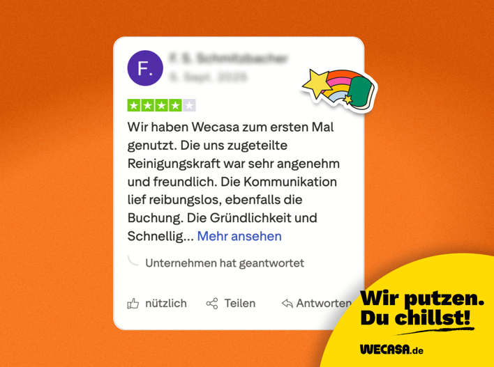 In diesem Artikel zeigen wir dir, was unsere Kund*innen über Wecasa sagen. Du erfährst auch, warum unser Modell eine faire, flexible und vertrauenswürdige Lösung für alle ist, die ihren Haushalt sauber halten möchten, ohne selbst ständig hinterher zu sein.